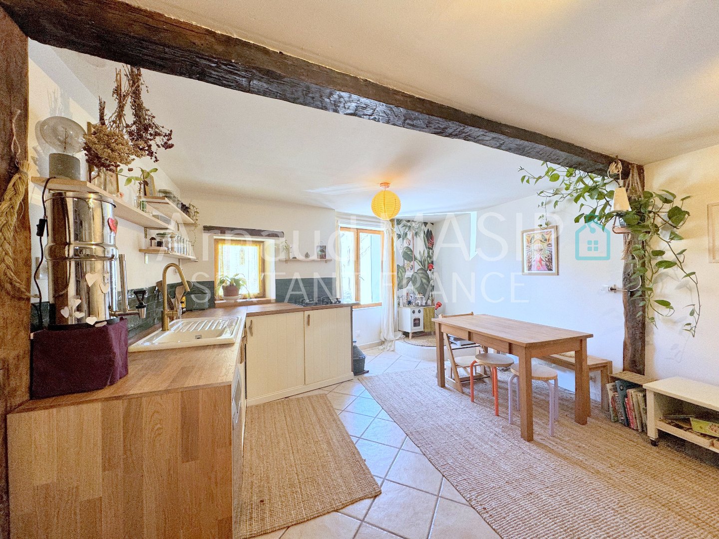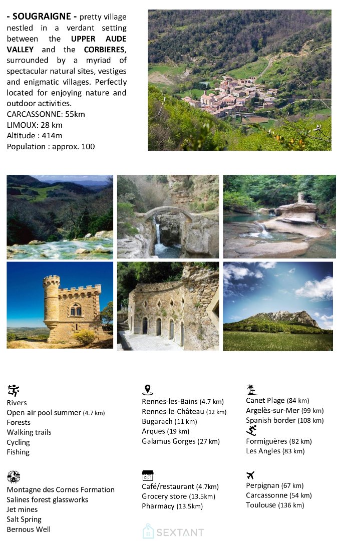EN EXCLUSIVITE SEXTANT FRANCE ARNAUD MASIP a le plaisir de vous proposer à la vente cette charmante maison de village d'environ 95m² habitables disposant de deux pièces couchage et offrant une rénovation de qualité et de bon goût, mêlant à merveille les matériaux chaleureux, parquets bois, poutres apparentes, pierres, le tout, sur une surface d'environ 95m² habitables. Les plus, une grande pièce en rez-de-chaussée idéale afin de créer une espace loisirs, atelier - les possibilités sont multiples - et surtout, une superbe terrasse exposée plein sud d'où vous aurez le loisir de savourer une sublime vue dégagée sur la nature environnante...un must ! Dotée d'un intérieur bien agencé et lumineux procurant un bien-être certain, cette habitation en très bon état se prête à divers projets : résidence principale ou secondaire, pied-à-terre au cœur de la campagne Audoise, et bien à potentiel locatif en Pays Cathare pour les amoureux de nature authentique et préservée. Cette maison blottie au cœur d'une vallée verdoyante et ses divers sites insolites, comme Rennes-les-Bains, Rennes-le-Château, ou bien le non moins célébrissime Bugarach, vous offre tout ce dont vous attendez pour retrouver les plaisirs d'une vie simple et ensoleillée dans le sud. Agencée en RDC + 2, les 95m² habitables développés comprennent en rez-de-chaussée une grande pièce de 33m² avec pièce buanderie et stockage sous escalier, au premier étage, à disposition, une généreuse pièce de vie ouverte avec cheminée insert et coin cuisine aménagée/dinatoire, SdE/WC et WC séparé. Le deuxième étage inondé de lumière, offrant quant à lui une spacieuse pièce de type couchage sous toiture, une chambre donnant sur la terrasse, et enfin, un accès à la terrasse pour profiter de l'extérieur en toute intimité. Pour connaisseurs et amateurs d'un certain art de vivre. Maison mitoyenne (1 face) - Assainissement collectif - Taxe foncière 607€ - Chauffage bois et électrique chaleur douce - Menuiseries double vitrage en bois - DPE 'D'- Tableau électrique aux normes - Pas de compteur Linky - Zones de parking public à proximité - Altitude 398m. SOUGRAINE : village typique dans la vallée de la Salz entre la Haute Vallée de l'Aude et les Corbières, proche du célèbre village de RENNES-LES-BAINS : station thermale et de remise en forme avec sa piscine à eau thermale et point de départ de promenades en pleine nature et de COUIZA, village tous commerces. L'aéroport de Carcassonne se situe à environ 1h, celui de Perpignan 1h20 et celui de Toulouse à 1h45 : venez savourer la Haute Vallée de l'Aude entre mer Méditerranée et Pyrénées. " Les informations sur les risques auxquels ce bien est exposé, sont disponibles sur le site Géorisques " : www.georisques.gouv. VISITE VIRTUELLE DU BIEN DISPONIBLE SUR NOTRE SITE SEXTANT FRANCE. Sextant France - Arnaud Masip agent basé à AXAT - 06 21 42 13 26 - Plus d'informations sur www.sextantfrance.fr réf. 25223